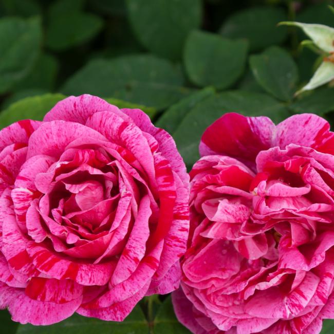 Schrub rose. Pink, crimson stripes. Strong fragrance. Medium, semi-double to double, cupped bloom form. Blooms in flushes throughout the season. Height of 120 to 245 cm.