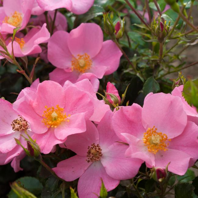 Salmon-pink, white center. Small, single, cluster-flowered, in large clusters, cupped-to-flat bloom form. Blooms in flushes throughout the season. Short, bushy, compact, dense, spreading, upright, well-branched. Small, glossy, dark green, dense foliage. Can be used for beds and borders, container rose, garden or landscape. very disease resistant.