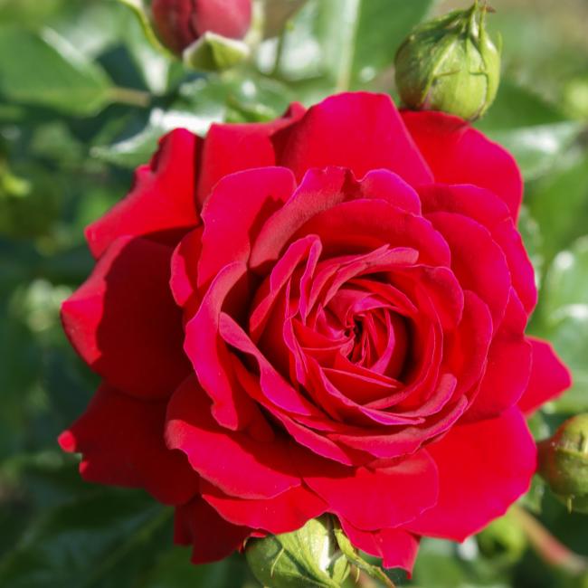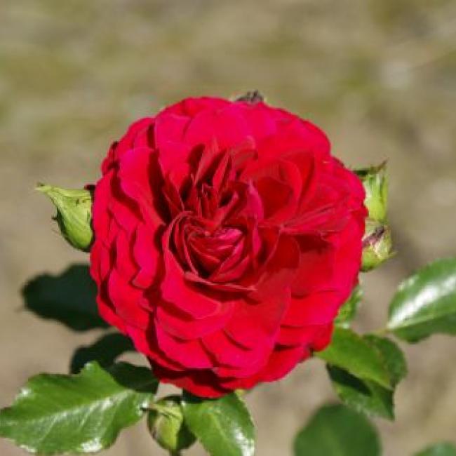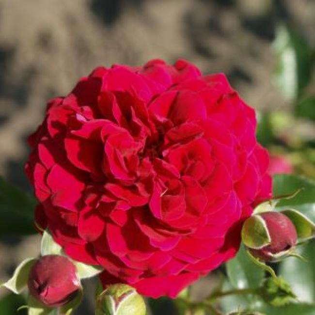 Dark red. Moderate, wild rose fragrance. Double bloom form. Blooms in flushes throughout the season.