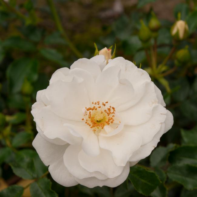 White or white blend. Moderate fragrance. Small to medium, semi-double, cluster-flowered, in large clusters bloom form. Continuous (perpetual) bloom throughout the season. Bushy, compact. Small, glossy, dark green foliage. Can be used for beds and borders, container rose, garden or ground cover. Very disease resistant, susceptible to Mildew.