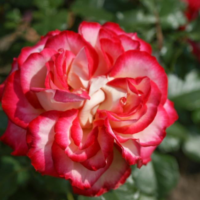 Dit is misschien wel een van meest bijzondere in deze groep. Witte rozen met cherry rode randen. Precies zoals op beeld is weergeven. Bloeit met korte dikke, stevige stelen met ieder 1 dikke bloem erop. De bladeren zijn donkergroen en glanzend. Hiermee is deze roos geschikt voor in pot, maar natuurlijk ook voor in het perk.